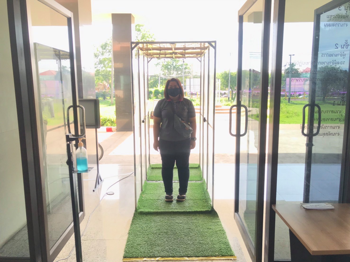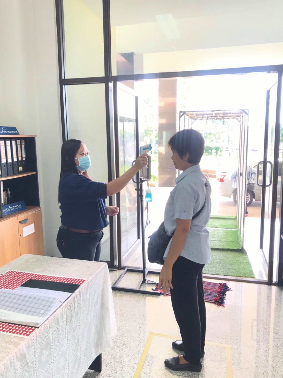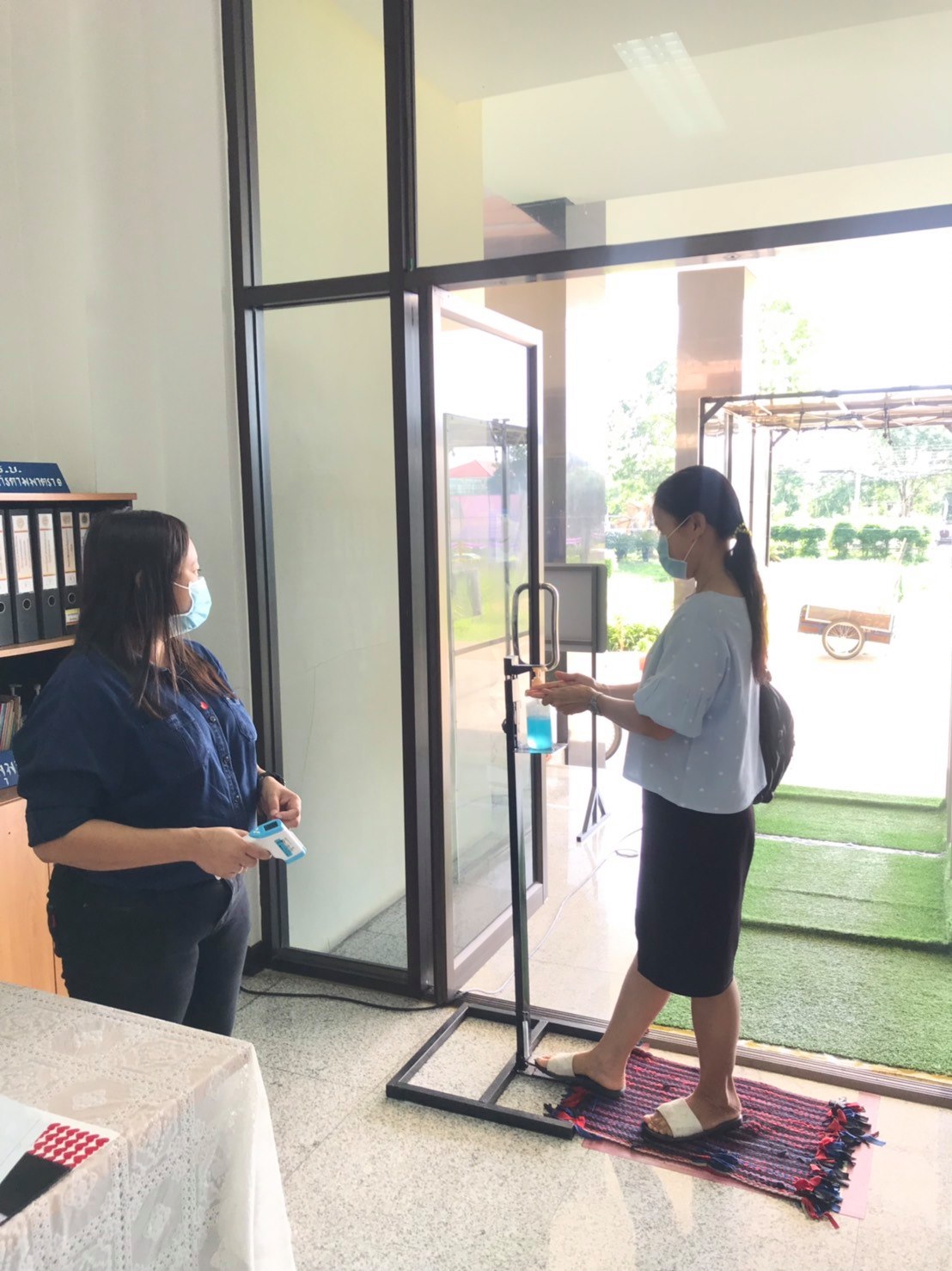 จัดตั้งตู้พ่นน้ำยาฆ่าเชื้อ และจุดคัดกรองด้วยเครื่องวัดอุณหภูมิ บริเวณทางเข้าด้านหน้าสำนักงาน ตรวจวัดไข้และคัดกรองข้าราชการ เจ้าหน้าที่