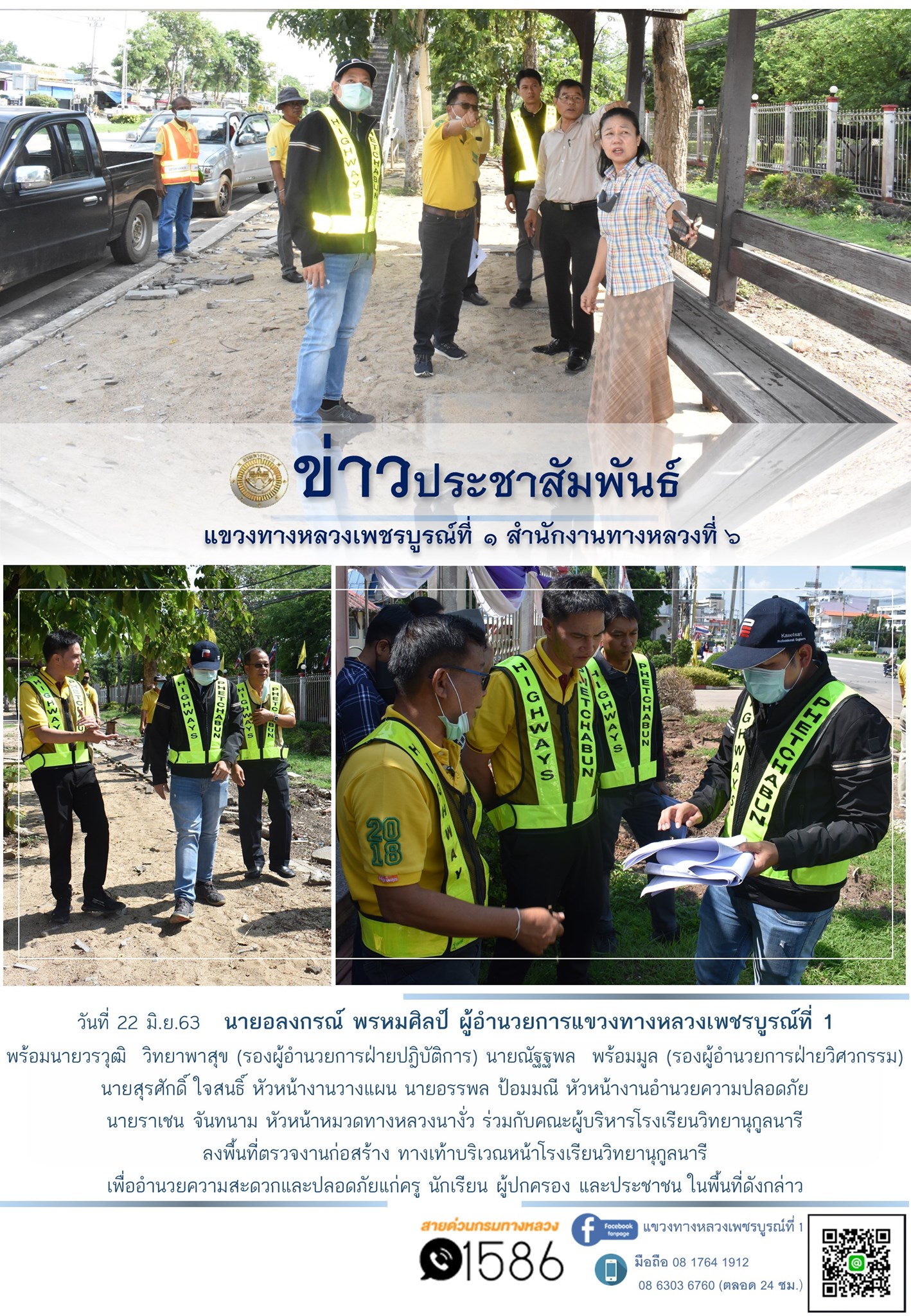 วันที่ 22 มิ.ย.63 นายอลงกรณ์ พรหมศิลป์ ผู้อำนวยการแขวงทางหลวงเพชรบูรณ์ที่ 1พร้อมนายวรวุฒิ วิทยาพาสุข (รองผู้อำนวยการฝ่ายปฎิบัติการ) นายณัฐฐพล พร้อมมูล (รองผู้อำนวยการฝ่ายวิศวกรรม) นายสุรศักดิ์ ใจสนธิ์ หัวหน้างานวางแผน นายอรรพล ป้อมมณี หัวหน้างานอำนวยความปลอดภัย นายราเชน จันทนาม หัวหน้าหมวดทางหลวงนางั่ว ร่วมกับคณะผู้บริหารโรงเรียนวิทยานุกูลนารี ลงพื้นที่ตรวจงานก่อสร้าง ทางเท้าบริเวณหน้าโรงเรียนวิทยานุกูลนารี เพื่ออำนวยความสะดวกและปลอดภัยแก่ครู นักเรียน ผู้ปกครอง และประชาชน ในพื้นที่ดังกล่าว