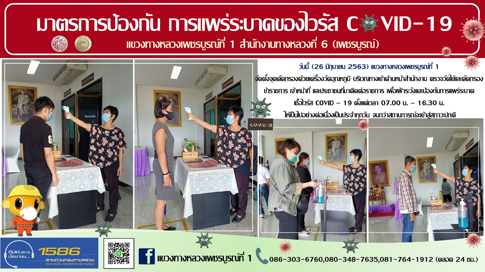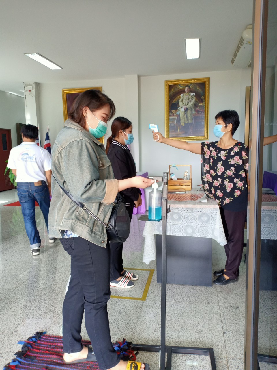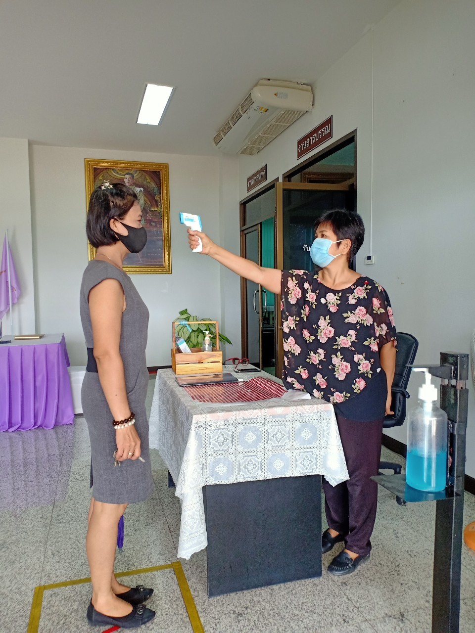 จัดตั้งตู้พ่นน้ำยาฆ่าเชื้อ และจุดคัดกรองด้วยเครื่องวัดอุณหภูมิ บริเวณทางเข้าด้านหน้าสำนักงาน ตรวจวัดไข้และคัดกรองข้าราชการ เจ้าหน้าที่และประชาชนที่มาติดต่อราชการ เพื่อเฝ้าระวังและป้องกันการแพร่ระบาด เชื้อไวรัส COVID – 19 ตั้งแต่เวลา 07.00 น. – 16.30 น.ให้เป็นไปอย่างต่อเนื่องเป็นประจำทุกวัน จนกว่าสถานการณ์จะเข้าสู่สภาวะปกติ