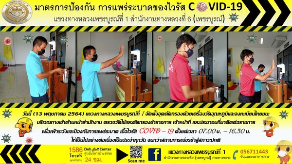 แขวงทางหลวงเพชรบูรณ์ที่ 1 จัดตั้งตู้พ่นน้ำยาฆ่าเชื้อ และจุดคัดกรองด้วยเครื่องวัดอุณหภูมิ วันที่ 13 พฤษภาคม 2564 ตั้งแต่เวลา 07.00 น. – 16.30 น.