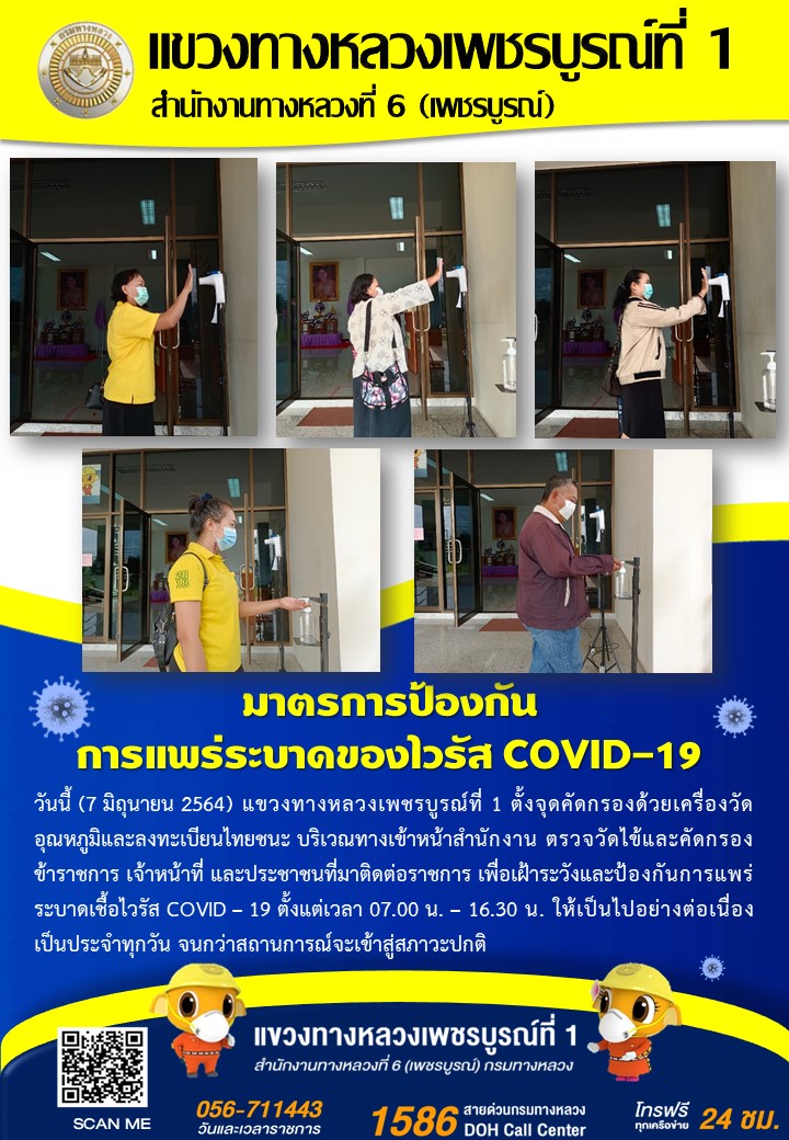 แขวงทางหลวงเพชรบูรณ์ที่ 1 จัดตั้งตู้พ่นน้ำยาฆ่าเชื้อ และจุดคัดกรองด้วยเครื่องวัดอุณหภูมิ วันที่ 7 มิถุนายน 2564 ตั้งแต่เวลา 07.00 น. – 16.30 น.