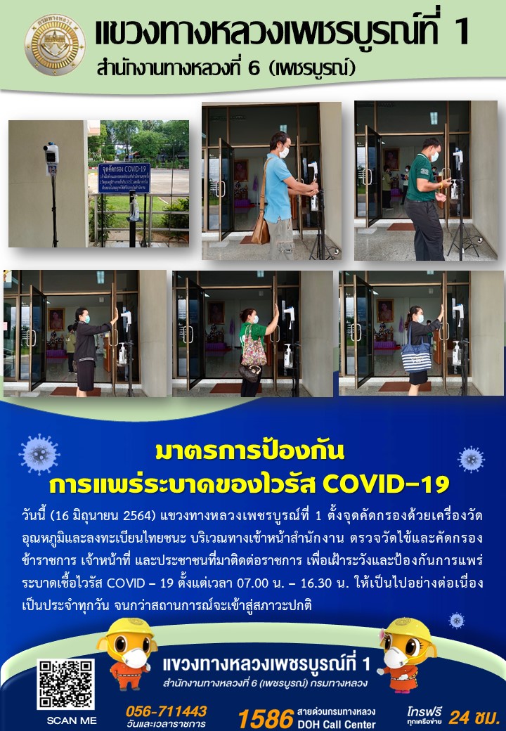 ได้จัดตั้งจุดคัดกรองด้วยเครื่องวัดอุณหภูมิ บริเวณทางเข้าด้านหน้สำนักงาน ตรวจวัดไข้และคัดกรองข้าราชการ เจ้าหน้าที่ และประชาชนที่มาติดต่อราชการ เพื่อเฝ้าระวังและป้องกันการแพร่ระบาด เชื้อไวรัส COVID – 19 ตั้งแต่เวลา 07.00 น. – 16.30 น. ให้เป็นไปอย่างต่อเนื่องเป็นประจำทุกวัน จนกว่าสถานการณ์จะเข้าสู่สภาวะปกติ