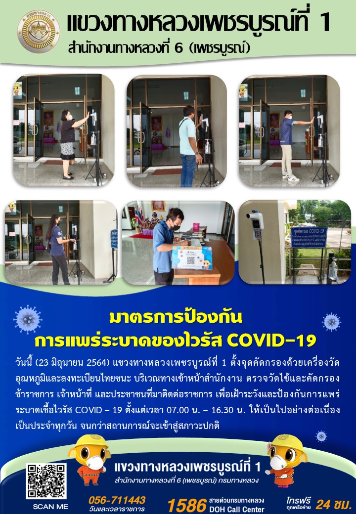 แขวงทางหลวงเพชรบูรณ์ที่ 1 จัดตั้งตู้พ่นน้ำยาฆ่าเชื้อ และจุดคัดกรองด้วยเครื่องวัดอุณหภูมิ วันที่ 23 มิถุนายน 2564 ตั้งแต่เวลา 07.00 น. – 16.30 น.