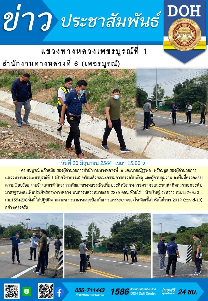 ดร.สมบูรณ์ แก้วลมัย รองผู้อำนวยการสำนักงานทางหลวงที่ 6 และนายณัฐฐพล พร้อมมูล รองผู้อำนวยการแขวงทางหลวงเพชรบูรณ์ที่ 1 (ฝ่ายวิศวกรรม) พร้อมด้วยคณะกรรมการตรวจรับพัสดุ และผู้ควบคุมงาน ลงพื้นที่ตรวจสอบความเรียบร้อย งานจ้างเหมาทำโครงการพัฒนาทางหลวงเพื่อเพิ่มประสิทธิภาพการจราจรและขนส่งกิจกรรมยกระดับมาตรฐานและเพิ่มประสิทธิภาพทางหลวง บนทางหลวงหมายเลข 2275 ตอน ห้วยไร่ - ห้วยใหญ่ ระหว่าง กม.152+350 - กม.155+238 ทั้งนี้ ได้ปฏิบัติตามมาตรการสาธารณสุขป้องกันการแพร่ระบาดของโรคติดเชื้อไวรัสโคโรนา 2019 (covid-19) อย่างเคร่งครัด