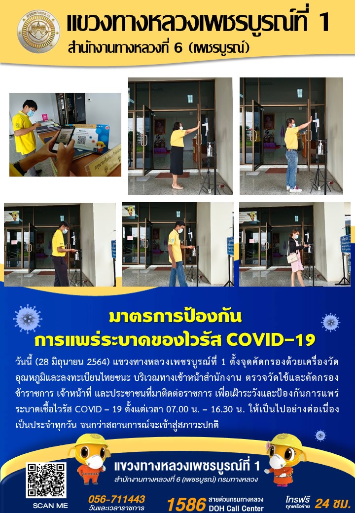 แขวงทางหลวงเพชรบูรณ์ที่ 1 จัดตั้งตู้พ่นน้ำยาฆ่าเชื้อ และจุดคัดกรองด้วยเครื่องวัดอุณหภูมิ วันที่ 28 มิถุนายน 2564 ตั้งแต่เวลา 07.00 น. – 16.30 น.