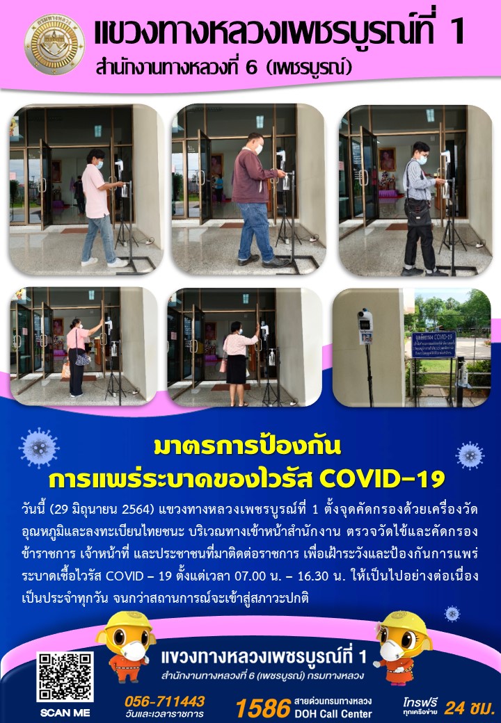 แขวงทางหลวงเพชรบูรณ์ที่ 1 จัดตั้งตู้พ่นน้ำยาฆ่าเชื้อ และจุดคัดกรองด้วยเครื่องวัดอุณหภูมิ วันที่ 29 มิถุนายน 2564 ตั้งแต่เวลา 07.00 น. – 16.30 น.