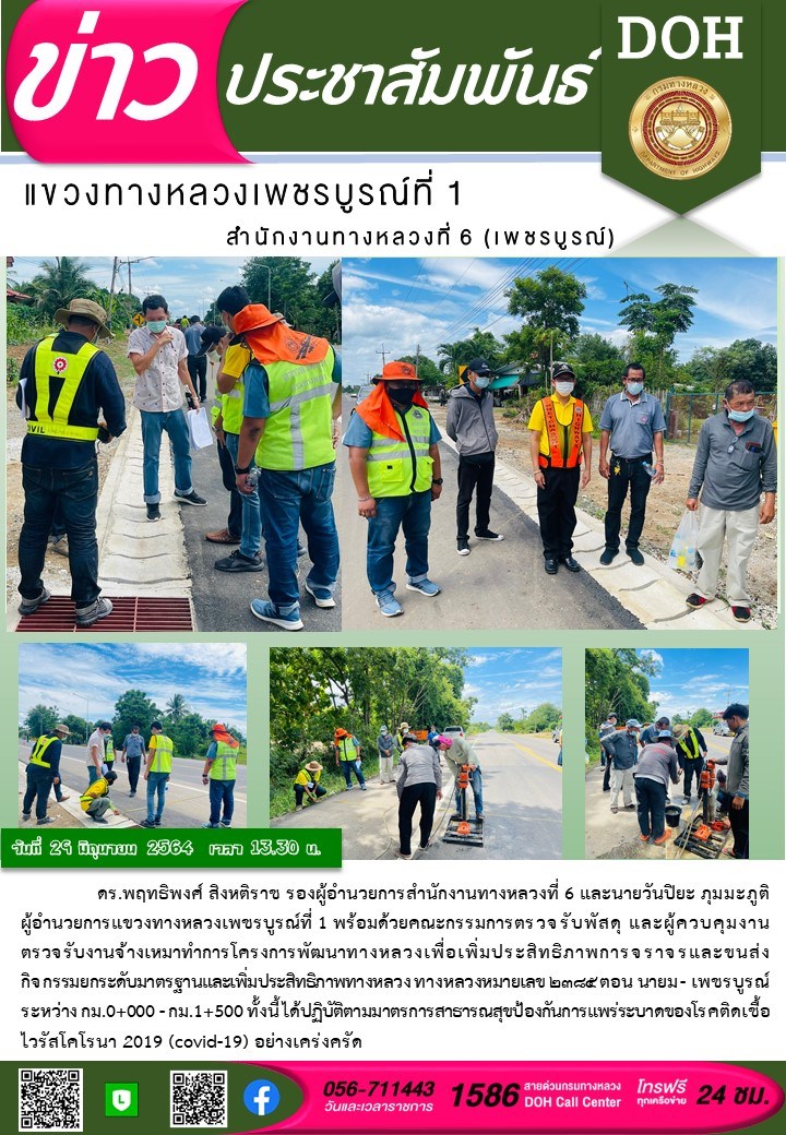 ดร.พฤทธิพงศ์ สิงหติราช รองผู้อำนวยการสำนักงานทางหลวงที่ 6 และนายวันปิยะ ภุมมะภูติ ผู้อำนวยการแขวงทางหลวงเพชรบูรณ์ที่ 1 พร้อมด้วยคณะกรรมการตรวจรับพัสดุ และผู้ควบคุมงาน ตรวจรับงานจ้างเหมาทำการโครงการพัฒนาทางหลวงเพื่อเพิ่มประสิทธิภาพการจราจรและขนส่ง กิจกรรมยกระดับมาตรฐานและเพิ่มประสิทธิภาพทางหลวง ทางหลวงหมายเลข 2385 ตอน นายม - เพชรบูรณ์ ระหว่าง กม.0+000 - กม.1+500 ทั้งนี้ ได้ปฏิบัติตามมาตรการสาธารณสุขป้องกันการแพร่ระบาดของโรคติดเชื้อไวรัสโคโรนา 2019 (covid-19) อย่างเคร่งครัด