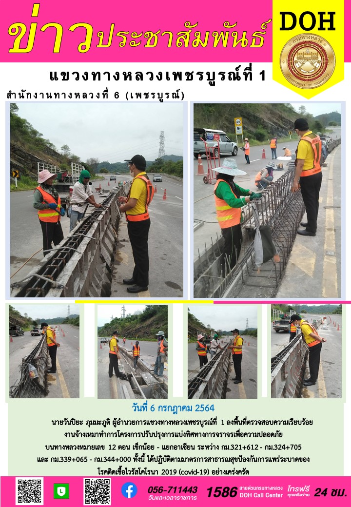 นายวันปิยะ ภุมมะภูติ ผู้อำนวยการแขวงทางหลวงเพชรบูรณ์ที่ 1 ลงพื้นที่ตรวจสอบความเรียบร้อย งานจ้างเหมาทำการโครงการปรับปรุงการแบ่งทิศทางการจราจรเพื่อความปลอดภัย บนทางหลวงหมายเลข 12 ตอน เข็กน้อย - แยกอาเซียน ระหว่าง กม.321+612 - กม.324+705 และ กม.339+065 - กม.344+000 ทั้งนี้ ได้ปฏิบัติตามมาตรการสาธารณสุขป้องกันการแพร่ระบาดของโรคติดเชื้อไวรัสโคโรนา 2019 (covid-19) อย่างเคร่งครัด