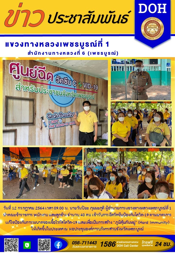 วันที่ 12 กรกฎาคม 2564 เวลา 09.00 น. นายวันปิยะ ภุมมะภูติ ผู้อำนวยการแขวงทางหลวงเพชรบูรณ์ที่ 1 นำคณะข้าราชการ พนักงาน และลูกจ้าง จำนวน 40 คน เข้ารับการฉีดวัคซีนป้องกันโควิด-19 ตามมาตรการแก้ไขป้องกันการระบาดของเชื้อไวรัสโควิด-19 และเพื่อเป็นการสร้าง “?ภูมิคุ้มกันหมู่” (Herd Immunity) ให้เกิดขึ้นในประเทศ ณ หอประชุมองค์การบริหารส่วนจังหวัดเพชรบูรณ์
