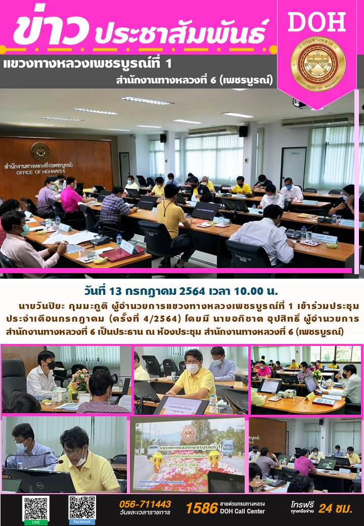 วันที่ 13 กรกฎาคม 2564 เวลา 10.00 น. นายวันปิยะ ภุมมะภูติ ผู้อำนวยการแขวงทางหลวงเพชรบูรณ์ที่ 1 เข้าร่วมประชุมประจำเดือนกรกฎาคม (ครั้งที่ 4/2564) โดยมี นายอภิชาต อุปสิทธิ์ ผู้อำนวยการสำนักงานทางหลวงที่ 6 เป็นประธาน ณ ห้องประชุม สำนักงานทางหลวงที่ 6 (เพชรบูรณ์)