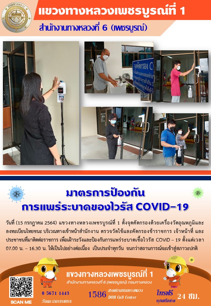แขวงทางหลวงเพชรบูรณ์ที่ 1 จัดตั้งตู้พ่นน้ำยาฆ่าเชื้อ และจุดคัดกรองด้วยเครื่องวัดอุณหภูมิ วันที่15 กรกฎาคม 2564 ตั้งแต่เวลา 07.00 น. – 16.30 น.
