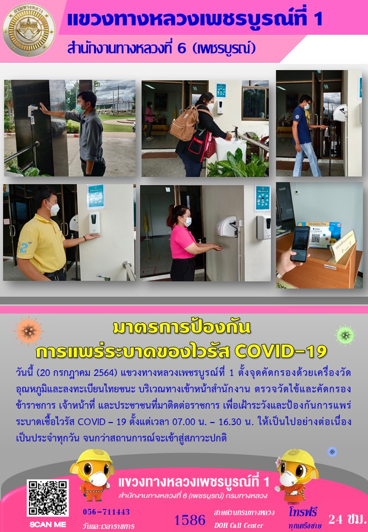 แขวงทางหลวงเพชรบูรณ์ที่ 1 จัดตั้งตู้พ่นน้ำยาฆ่าเชื้อ และจุดคัดกรองด้วยเครื่องวัดอุณหภูมิ วันที่20 กรกฎาคม 2564 ตั้งแต่เวลา 07.00 น. – 16.30 น.