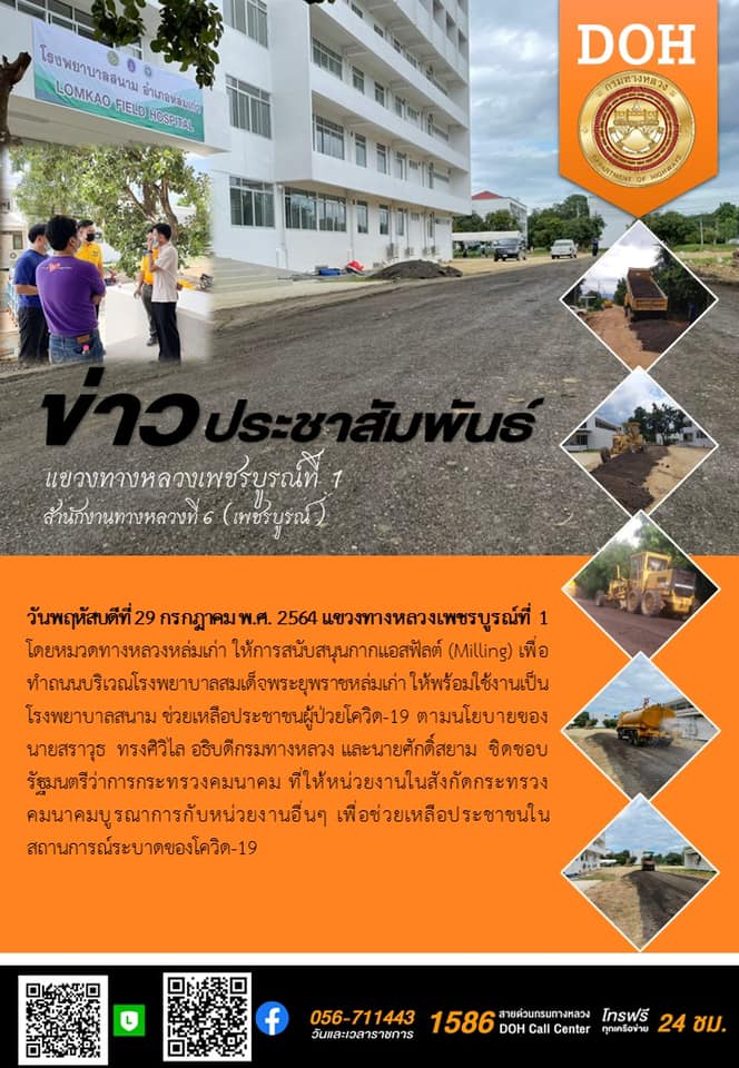 วันพฤหัสบดีที่ 29 กรกฎาคม พ.ศ. 2564 แขวงทางหลวงเพชรบูรณ์ที่ 1 โดยหมวดทางหลวงหล่มเก่า ให้การสนับสนุนกากแอสฟัลต์ (Milling) เพื่อทำถนนบริเวณโรงพยาบาลสมเด็จพระยุพราชหล่มเก่า ให้พร้อมใช้งานเป็นโรงพยาบาลสนาม ช่วยเหลือประชาชนผู้ป่วยโควิด-19 ตามนโยบายของ นายสราวุธ ทรงศิวิไล อธิบดีกรมทางหลวง และนายศักดิ์สยาม ชิดชอบ รัฐมนตรีว่าการกระทรวงคมนาคม ที่ให้หน่วยงานในสังกัดกระทรวงคมนาคมบูรณาการกับหน่วยงานอื่นๆ เพื่อช่วยเหลือประชาชนในสถานการณ์ระบาดของโควิด-19