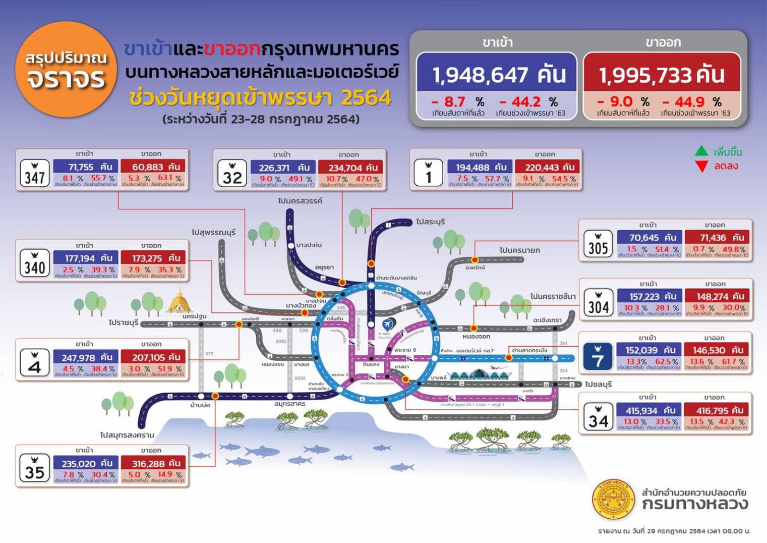กรมทางหลวง สรุปจำนวนปริมาณจราจรเข้า-ออกกรุงเทพฯ บนทางหลวงสายหลัก และมอเตอร์เวย์ จำนวน 10 เส้นทาง ในช่วงวันหยุดต่อเนื่องวันอาสาฬหบูชาและวันเข้าพรรษาในระหว่างวันที่ 23 - 28 ก.ค. 64 พบยอดการเดินทางลดลงกว่า 3.2 ล้านคัน เมื่อเทียบกับปีที่ผ่านมา