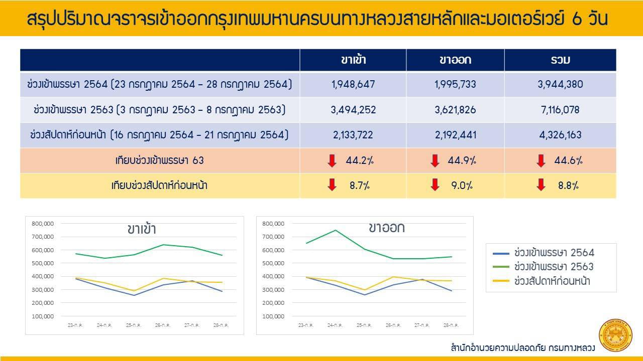 โดยระหว่างวันที่ 23 – 28 กรกฎาคม 2564 มีจำนวนปริมาณจราจรเข้าและออกกรุงเทพมหานคร รวมทั้งสิ้น 3,944,380 คัน โดยมีรายละเอียดดังนี้