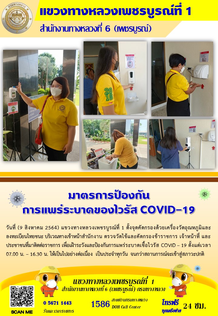 แขวงทางหลวงเพชรบูรณ์ที่ 1 จัดตั้งตู้พ่นน้ำยาฆ่าเชื้อ และจุดคัดกรองด้วยเครื่องวัดอุณหภูมิ วันที่ 9 สิงหาคม 2564 ตั้งแต่เวลา 07.00 น. – 16.30 น.