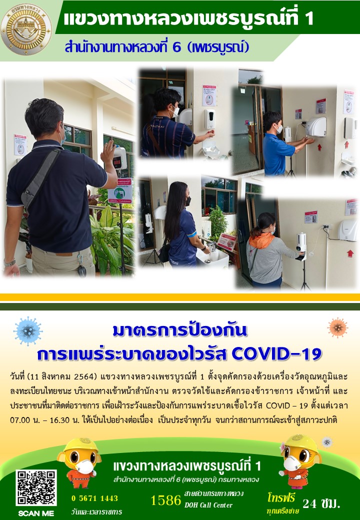 แขวงทางหลวงเพชรบูรณ์ที่ 1 จัดตั้งตู้พ่นน้ำยาฆ่าเชื้อ และจุดคัดกรองด้วยเครื่องวัดอุณหภูมิ วันที่ 11 สิงหาคม 2564 ตั้งแต่เวลา 07.00 น. – 16.30