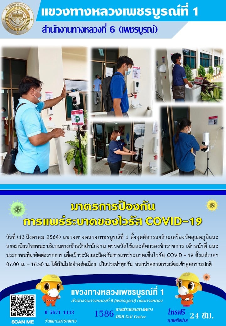 แขวงทางหลวงเพชรบูรณ์ที่ 1 จัดตั้งตู้พ่นน้ำยาฆ่าเชื้อ และจุดคัดกรองด้วยเครื่องวัดอุณหภูมิ วันที่ 13 สิงหาคม 2564 ตั้งแต่เวลา 07.00 น. – 16.30