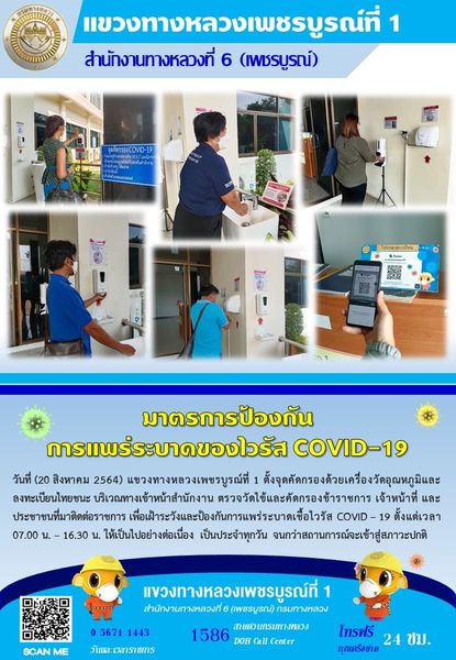 แขวงทางหลวงเพชรบูรณ์ที่ 1 จัดตั้งตู้พ่นน้ำยาฆ่าเชื้อ และจุดคัดกรองด้วยเครื่องวัดอุณหภูมิ วันที่ 20 สิงหาคม 2564 ตั้งแต่เวลา 07.00 น. – 16.30