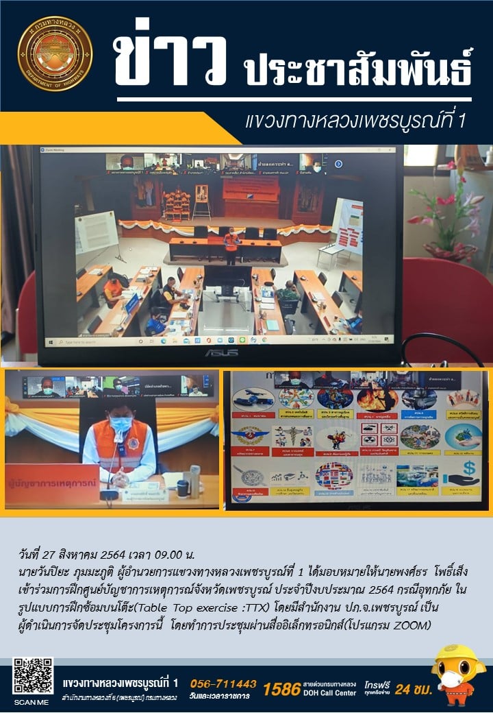 วันที่ 27 สิงหาคม 2564 เวลา 09.00 น. นายวันปิยะ ภุมมะภูติ ผู้อำนวยการแขวงทางหลวงเพชรบูรณ์ที่ 1 ได้มอบหมายให้นายพงศ์ธร โพธิ์เส็ง เข้าร่วมการฝึกศูนย์บัญชาการเหตุการณ์จังหวัดเพชรบูรณ์ ประจำปีงบประมาณ 2564 กรณีอุทกภัย ในรูปแบบการฝึกซ้อมบนโต๊ะ(Table Top exercise :TTX) โดยมีสำนักงาน ปภ.จ.เพชรบูรณ์ เป็นผู้ดำเนินการจัดประชุมโครงการนี้ โดยทำการประชุมผ่านสื่ออิเล็กทรอนิกส์(โปรแกรม ZOOM)