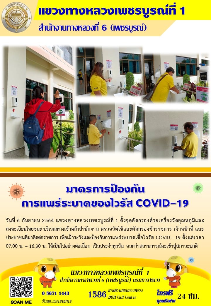 แขวงทางหลวงเพชรบูรณ์ที่ 1 จัดตั้งตู้พ่นน้ำยาฆ่าเชื้อ และจุดคัดกรองด้วยเครื่องวัดอุณหภูมิ วันที่ 6 กันยายน 2564 ตั้งแต่เวลา 07.00 น. – 16.300
