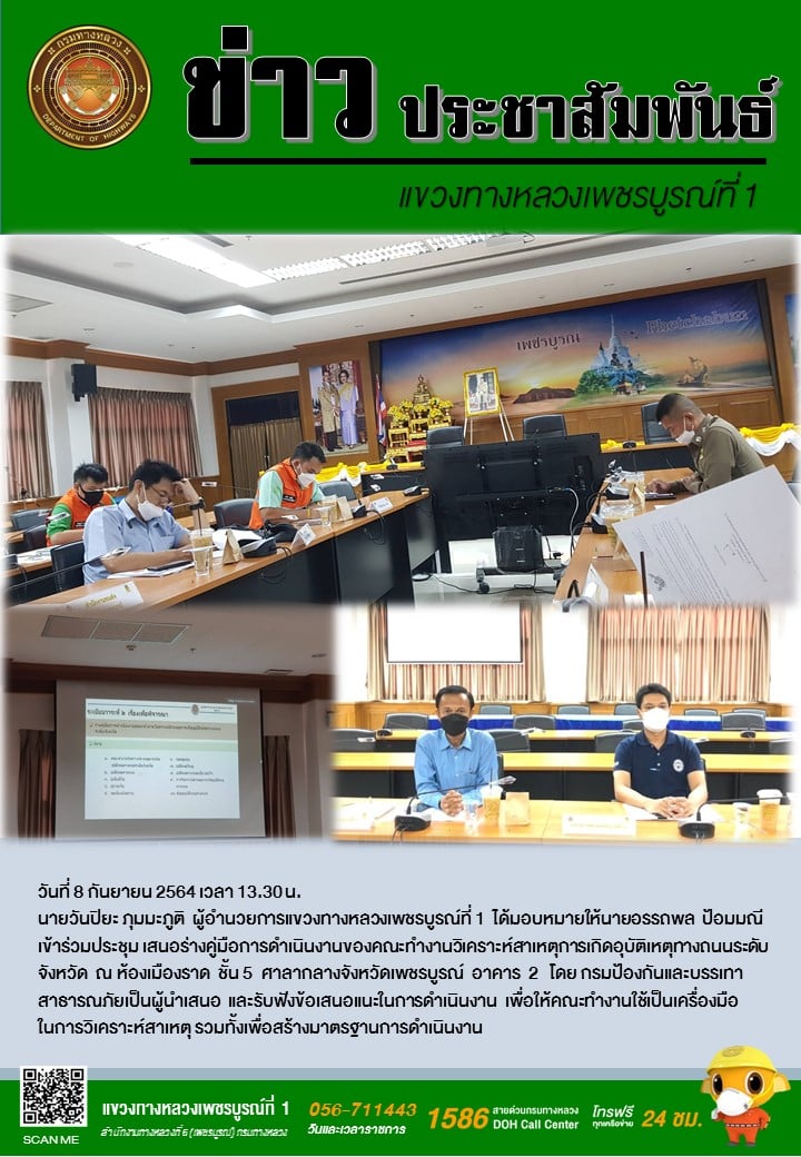 วันที่ 8 กันยายน 2564 เวลา 13.30 น. นายวันปิยะ ภุมมะภูติ ผู้อำนวยการแขวงทางหลวงเพชรบูรณ์ที่ 1 ได้มอบหมายให้นายอรรถพล ป้อมมณี เข้าร่วมประชุม เสนอร่างคู่มือการดำเนินงานของคณะทำงานวิเคราะห์สาเหตุการเกิดอุบัติเหตุทางถนนระดับจังหวัด ณ ห้องเมืองราด ชั้น 5 ศาลากลางจังหวัดเพชรบูรณ์ อาคาร 2 โดย กรมป้องกันและบรรเทาสาธารณภัยเป็นผู้นำเสนอ และรับฟังข้อเสนอแนะในการดำเนินงาน เพื่อให้คณะทำงานใช้เป็นเครื่องมือในการวิเคราะห์สาเหตุ รวมทั้งเพื่อสร้างมาตรฐานการดำเนินงาน