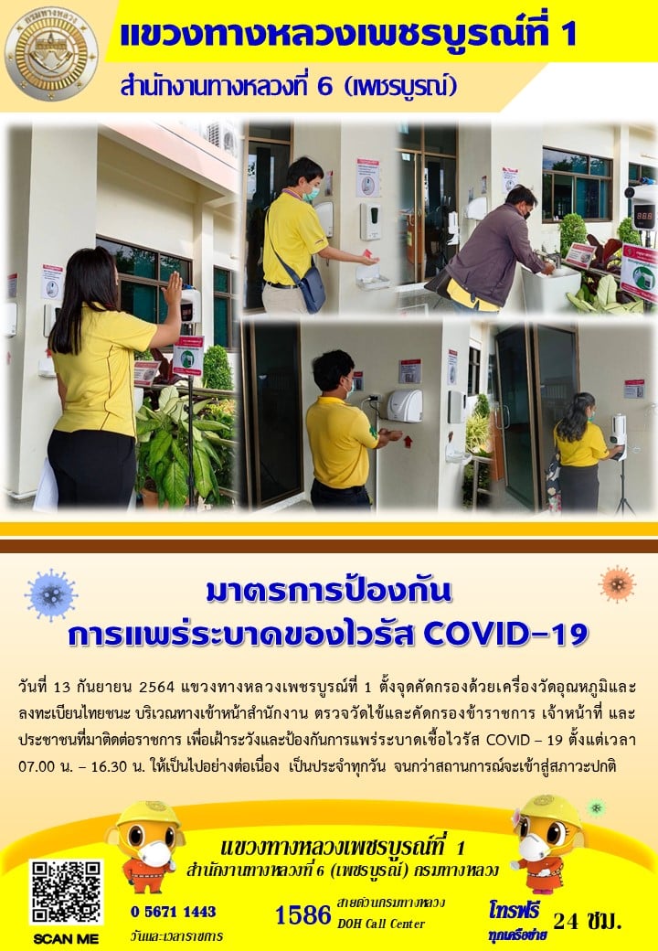 แขวงทางหลวงเพชรบูรณ์ที่ 1 จัดตั้งตู้พ่นน้ำยาฆ่าเชื้อ และจุดคัดกรองด้วยเครื่องวัดอุณหภูมิ วันที่ 13 กันยายน 2564 ตั้งแต่เวลา 07.00 น. – 16.300