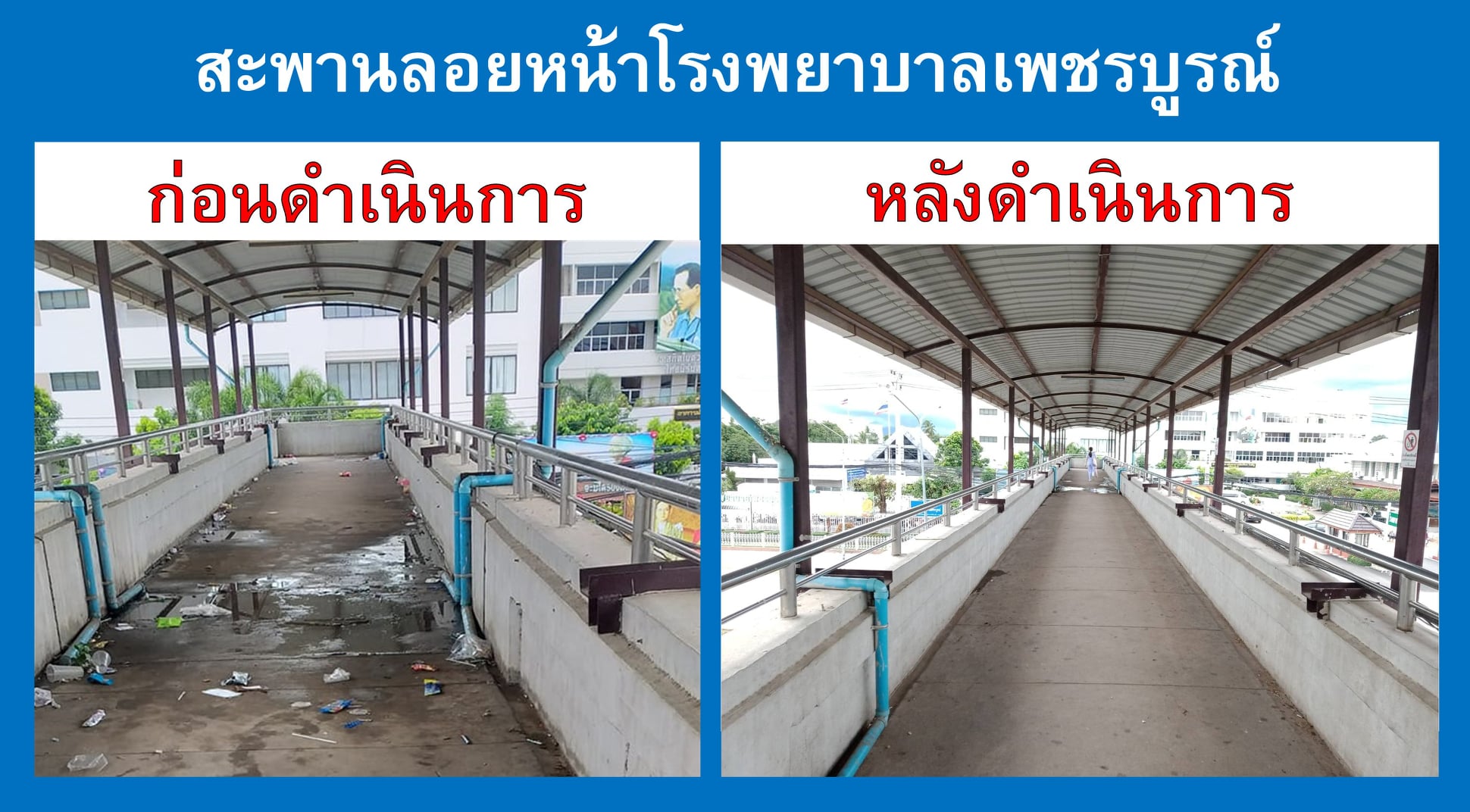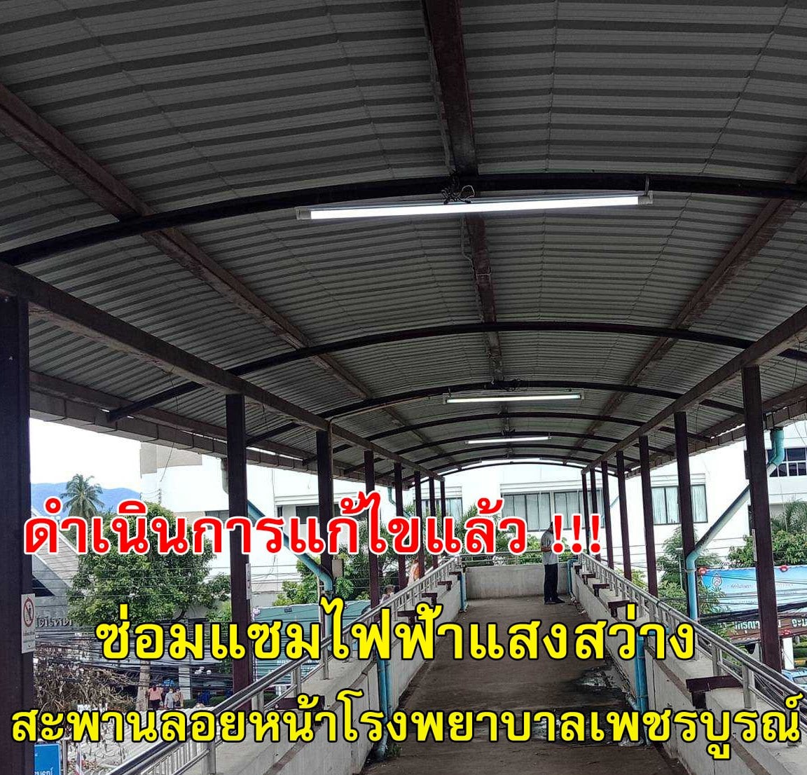 จากกรณีที่มีผู้ใช้เฟสบุ๊ค โพสต์ในสื่อโซเชียล เพจ “รวมข่าวแชร์เพชรบูรณ์” ว่ามีผู้ทิ้งขยะ บริเวณสะพานลอยหน้าโรงพยาบาลเพชรบูรณ์ เมื่อวันที่ 23 กันยายน 2564 เวลา 15.41 น. แขวงทางหลวงเพชรบูรณ์ที่ 1 ได้เร่งดำเนินการทำความสะอาดบริเวณสะพานลอยหน้าโรงพยาบาลเพชรบูรณ์แล้ว เมื่อวันที่ 23 กันยายน 2564 เวลา 16.00 น. และดำเนินการซ่อมแซมไฟฟ้าแสงสว่าง บริเวณสะพานลอยหน้าโรงพยาบาลเพชรบูรณ์ จนสามารถใช้งานได้เป็นปกติแล้ว เมื่อวันที่ 27 กันยายน 2564 เวลาประมาณ 13.00 น. ทั้งนี้ เพื่ออำนวยความสะดวกและปลอดภัยแก่ประชาชน