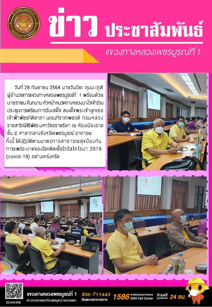 วันที่ 28 กันยายน 2564 นายวันปิยะ ภุมมะภูติ ผู้อำนวยการแขวงทางหลวงเพชรบูรณ์ที่ 1 พร้อมด้วย นายราเชน จันทนาม หัวหน้าหมวดทางหลวงนางั่วเข้าร่วมประชุมการเตรียมการรับเสด็จ สมเด็จพระเจ้าลูกเธอเจ้าฟ้าพัชรกิติยาภา นเรนทิราเทพยวดี กรมหลวง ราชสาริณีสิริพัชร มหาวัชรราชธิดา ณ ห้องเมืองราด ชั้น 5 ศาลากลางจังหวัดเพชรบูรณ์ อาคาร 2 ทั้งนี้ ได้ปฏิบัติตามมาตรการสาธารณสุขป้องกันการแพร่ระบาดของโรคติดเชื้อไวรัสโคโรนา 2019 (covid-19) อย่างเคร่งครัด