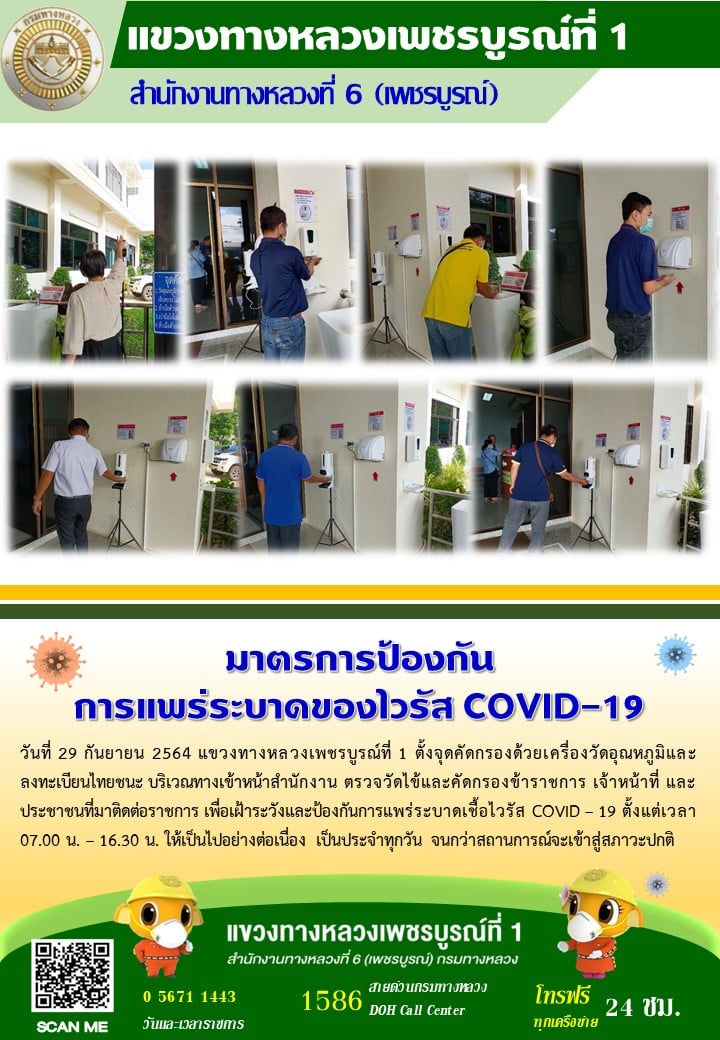 แขวงทางหลวงเพชรบูรณ์ที่ 1 จัดตั้งตู้พ่นน้ำยาฆ่าเชื้อ และจุดคัดกรองด้วยเครื่องวัดอุณหภูมิ วันที่ 29 กันยายน 2564 ตั้งแต่เวลา 07.00 น. – 16.30 น.