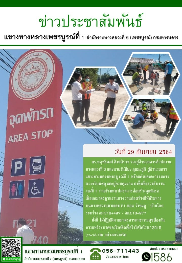 วันพุธที่ 29 กันยายน 2564 ดร.พฤทธิพงศ์ สิงหติราช รองผู้อำนวยการสำนักงานทางหลวงที่ 6 และนายวันปิยะ ภุมมะภูติ ผู้อำนวยการแขวงทางหลวงเพชรบูรณ์ที่ 1 พร้อมด้วยคณะกรรมการตรวจรับพัสดุ และผู้ควบคุมงาน ลงพื้นที่ตรวจรับงาน งวดที่ 1 งานจ้างเหมาโครงการก่อสร้างจุดพักรถ เพื่อยกมาตรฐานงานทาง งานก่อสร้างที่พักริมทาง บนทางหลวงหมายเลข 21 ตอน วังชมภู - บ้านโตก ระหว่าง กม.213+497 - กม.213+977