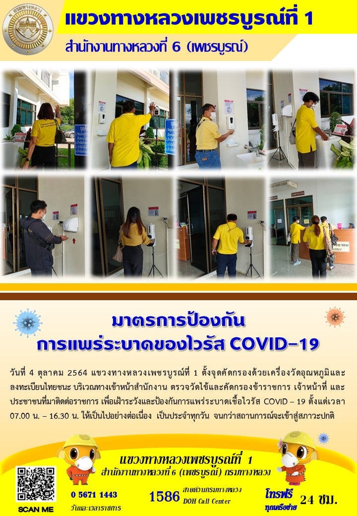 แขวงทางหลวงเพชรบูรณ์ที่ 1 จัดตั้งตู้พ่นน้ำยาฆ่าเชื้อ และจุดคัดกรองด้วยเครื่องวัดอุณหภูมิ วันที่ 4 ตุลาคม 2564 ตั้งแต่เวลา 07.00 น. – 16.30 น.