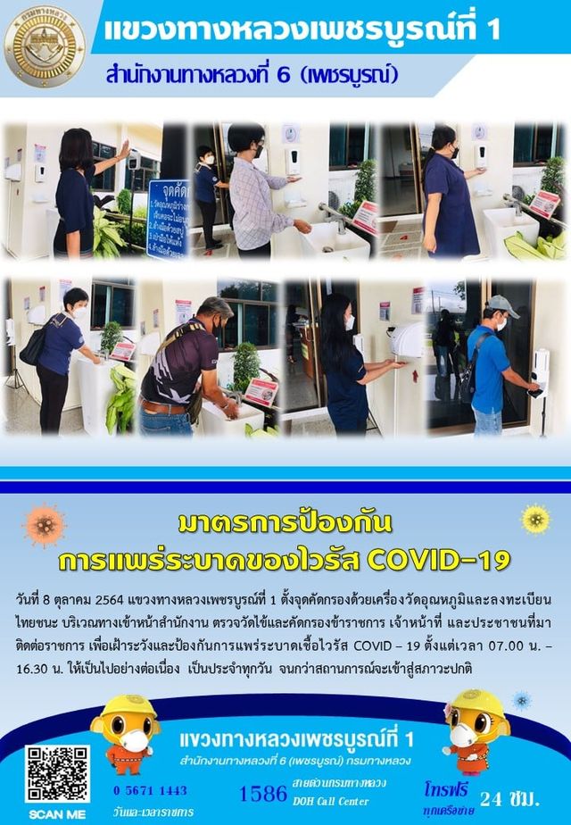 แขวงทางหลวงเพชรบูรณ์ที่ 1 จัดตั้งตู้พ่นน้ำยาฆ่าเชื้อ และจุดคัดกรองด้วยเครื่องวัดอุณหภูมิ วันที่ 8 ตุลาคม 2564 ตั้งแต่เวลา 07.00 น. – 16.30 น.