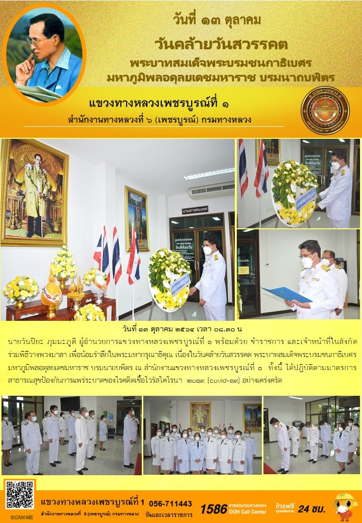 นายวันปิยะ ภุมมะภูติ ผู้อำนวยการแขวงทางหลวงเพชรบูรณ์ที่ ๑ พร้อมด้วย ข้าราชการ และเจ้าหน้าที่ในสังกัด ร่วมพิธีวางพวงมาลา เพื่อน้อมรำลึกในพระมหากรุณาธิคุณ เนื่องในวันคล้ายวันสวรรคต พระบาทสมเด็จพระบรมชนกาธิเบศร มหาภูมิพลอดุลยเดชมหาราช บรมนาถบพิตร ณ สำนักงานแขวงทางหลวงเพชรบูรณ์ที่ ๑ ทั้งนี้ ได้ปฏิบัติตามมาตรการสาธารณสุขป้องกันการแพร่ระบาดของโรคติดเชื้อไวรัสโคโรนา ๒o๑๙ (covid-๑๙) อย่างเคร่งครัด
