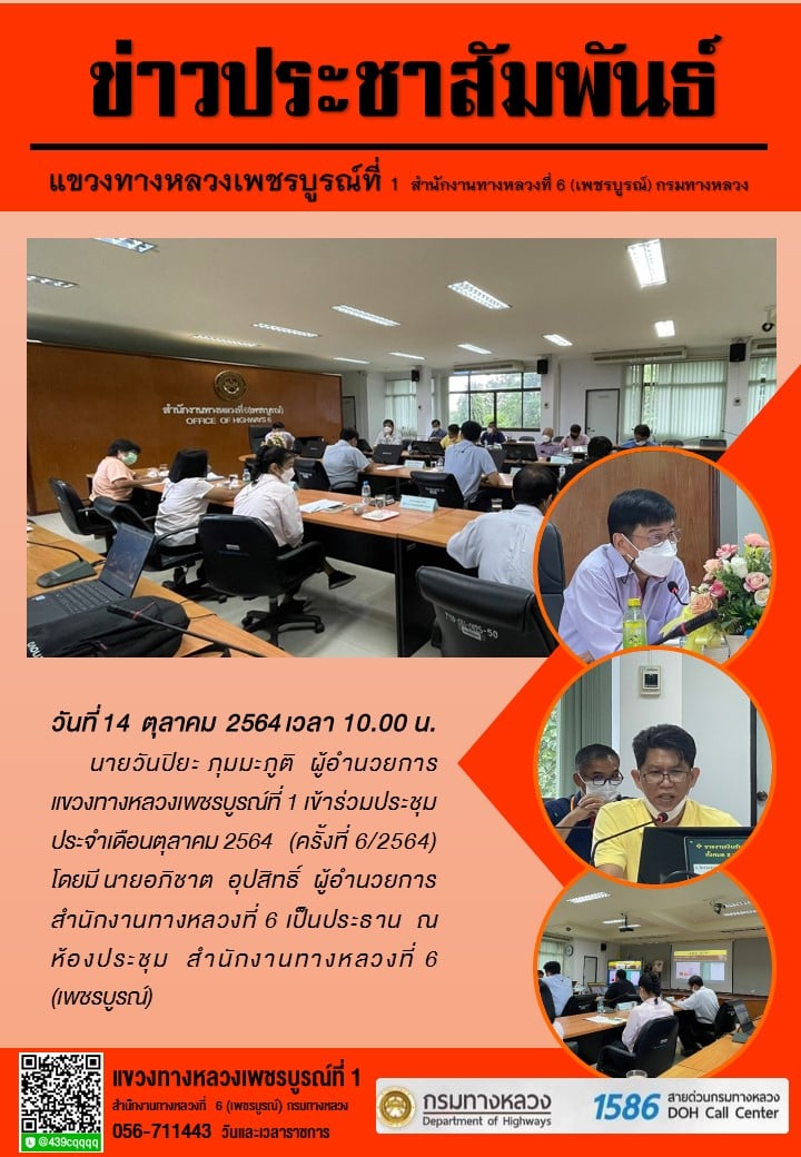 นายวันปิยะ ภุมมะภูติ ผู้อำนวยการแขวงทางหลวงเพชรบูรณ์ที่ 1 เข้าร่วมประชุมประจำเดือนตุลาคม 2564 (ครั้งที่ 6/2564) โดยมี นายอภิชาต อุปสิทธิ์ ผู้อำนวยการสำนักงานทางหลวงที่ 6 เป็นประธาน ณ ห้องประชุม สำนักงานทางหลวงที่ 6 (เพชรบูรณ์)