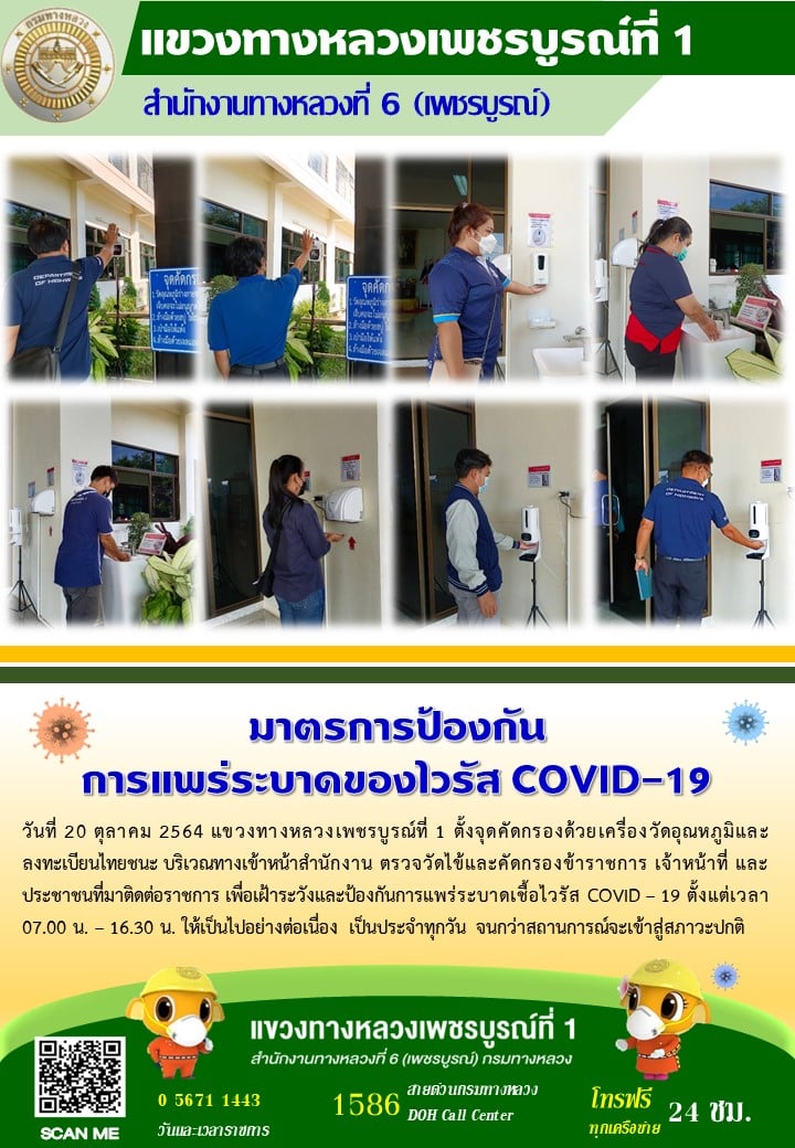 แขวงทางหลวงเพชรบูรณ์ที่ 1 จัดตั้งตู้พ่นน้ำยาฆ่าเชื้อ และจุดคัดกรองด้วยเครื่องวัดอุณหภูมิ วันที่ 20 ตุลาคม 2564 ตั้งแต่เวลา 07.00 น. – 16.30 น.