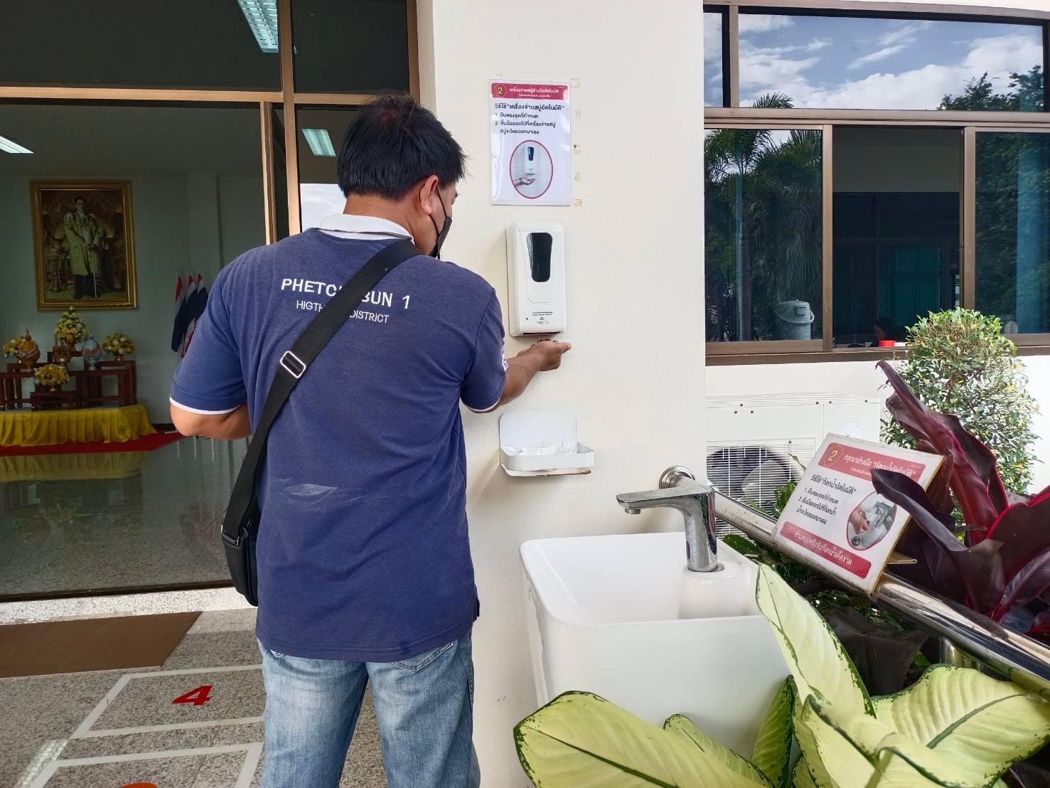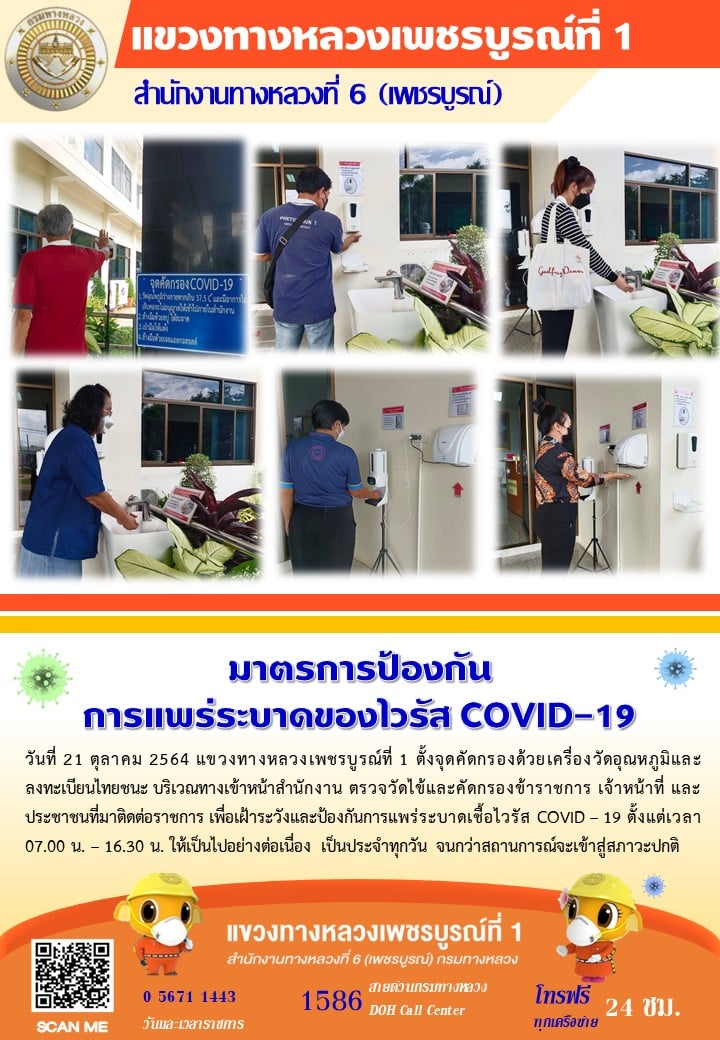 แขวงทางหลวงเพชรบูรณ์ที่ 1 จัดตั้งตู้พ่นน้ำยาฆ่าเชื้อ และจุดคัดกรองด้วยเครื่องวัดอุณหภูมิ วันที่ 21 ตุลาคม 2564 ตั้งแต่เวลา 07.00 น. – 16.30 น.