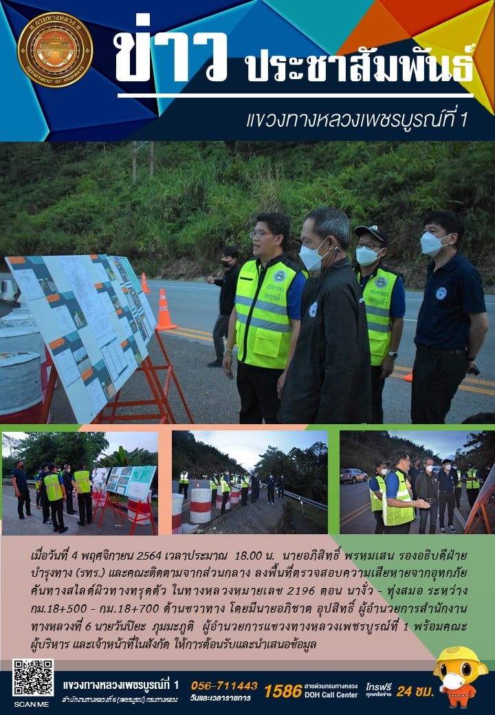 วันที่ 4 พฤศจิกายน 2564 เวลาประมาณ 18.00 น. นายอภิสิทธิ์ พรหมเสน รองอธิบดีฝ่ายบำรุงทาง (รทร.) และคณะติดตามจากส่วนกลาง ลงพื้นที่ตรวจสอบความเสียหายจากอุทกภัยคันทางสไลด์ผิวทางทรุดตัว ในทางหลวงหมายเลข 2196 ตอน นางั่ว - ทุ่งสมอ ระหว่าง กม.18+500 - กม.18+700 ด้านขวาทาง โดยมีนายอภิชาต อุปสิทธิ์ ผู้อำนวยการสำนักงานทางหลวงที่ 6 นายวันปิยะ ภุมมะภูติ ผู้อำนวยการแขวงทางหลวงเพชรบูรณ์ที่ 1 พร้อมคณะผู้บริหาร และเจ้าหน้าที่ในสังกัด ให้การต้อนรับและนำเสนอข้อมูล