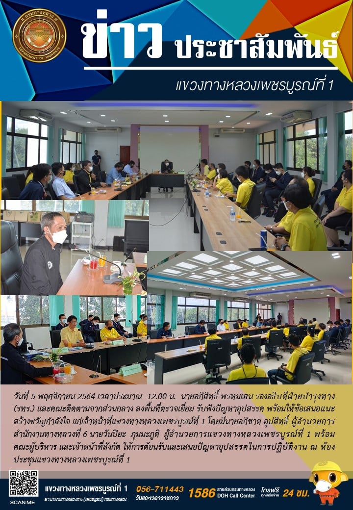 วันที่ 5 พฤศจิกายน 2564 เวลาประมาณ 12.00 น. นายอภิสิทธิ์ พรหมเสน รองอธิบดีฝ่ายบำรุงทาง (รทร.) และคณะติดตามจากส่วนกลาง ลงพื้นที่ตรวจเยี่ยม รับฟังปัญหาอุปสรรค พร้อมให้ข้อเสนอแนะ สร้างขวัญกำลังใจ แก่เจ้าหน้าที่แขวงทางหลวงเพชรบูรณ์ที่ 1 โดยมีนายอภิชาต อุปสิทธิ์ ผู้อำนวยการสำนักงานทางหลวงที่ 6 นายวันปิยะ ภุมมะภูติ ผู้อำนวยการแขวงทางหลวงเพชรบูรณ์ที่ 1 พร้อมคณะผู้บริหาร และเจ้าหน้าที่สังกัด ให้การต้อนรับและเสนอปัญหาอุปสรรคในการปฏิบัติงาน ณ ห้องประชุมแขวงทางหลวงเพชรบูรณ์ที่ 1
