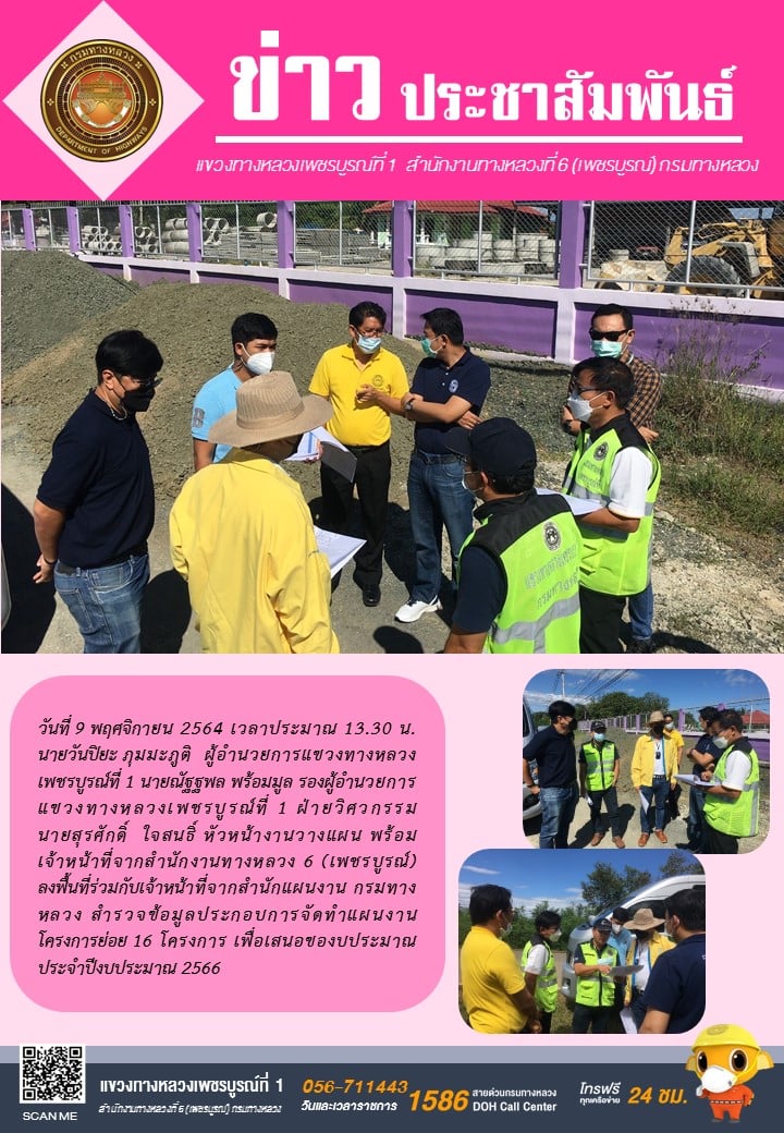 วันที่ 9 พฤศจิกายน 2564 เวลาประมาณ 13.30 น. นายวันปิยะ ภุมมะภูติ ผู้อำนวยการแขวงทางหลวงเพชรบูรณ์ที่ 1 นายณัฐฐพล พร้อมมูล รองผู้อำนวยการแขวงทางหลวงเพชรบูรณ์ที่ 1 ฝ่ายวิศวกรรม นายสุรศักดิ์ ใจสนธิ์ หัวหน้างานวางแผน พร้อมเจ้าหน้าที่จากสำนักงานทางหลวง 6 (เพชรบูรณ์) ลงพื้นที่ร่วมกับเจ้าหน้าที่จากสำนักแผนงาน กรมทางหลวง สำรวจข้อมูลประกอบการจัดทำแผนงาน โครงการย่อย 16 โครงการ เพื่อเสนอของบประมาณประจำปีงบประมาณ 2566