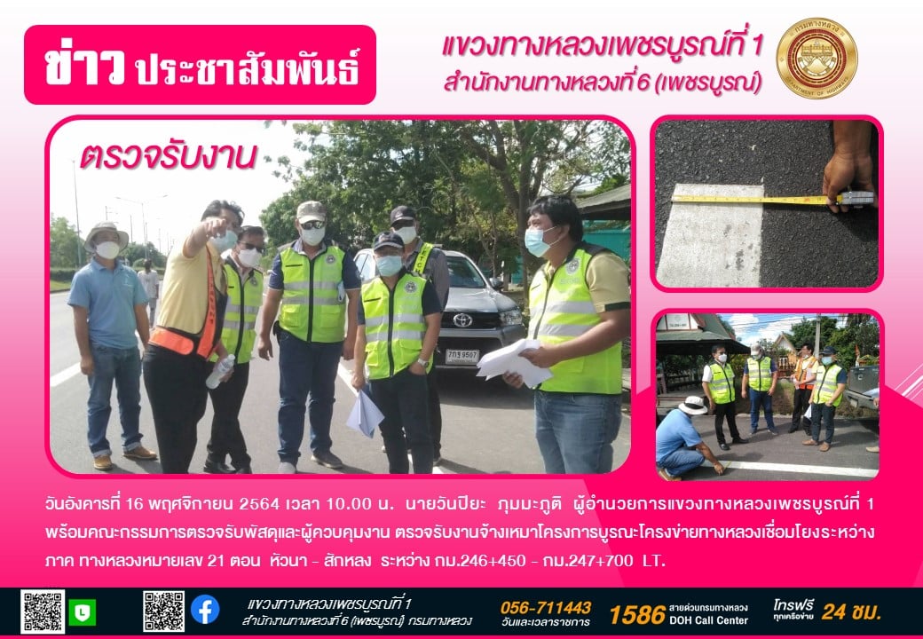 วันอังคารที่ 16 พฤศจิกายน 2564 เวลา 10.00 น. นายวันปิยะ ภุมมะภูติ ผู้อำนวยการแขวงทางหลวงเพชรบูรณ์ที่ 1 พร้อมคณะกรรมการตรวจรับพัสดุและผู้ควบคุมงาน ตรวจรับงานจ้างเหมาโครงการบูรณะโครงข่ายทางหลวงเชื่อมโยงระหว่างภาค ทางหลวงหมายเลข 21 ตอน หัวนา - สักหลง ระหว่าง กม.246+450 - กม.247+700 LT.