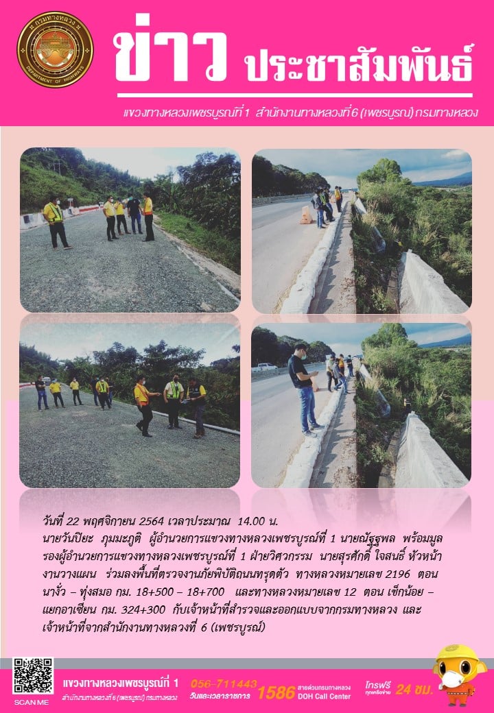 วันที่ 22 พฤศจิกายน 2564 เวลาประมาณ 14.00 น. นายวันปิยะ ภุมมะภูติ ผู้อำนวยการแขวงทางหลวงเพชรบูรณ์ที่ 1 นายณัฐฐพล พร้อมมูล รองผู้อำนวยการแขวงทางหลวงเพชรบูรณ์ที่ 1 ฝ่ายวิศวกรรม นายสุรศักดิ์ ใจสนธิ์ หัวหน้างานวางแผน ร่วมลงพื้นที่ตรวจงานภัยพิบัติถนนทรุดตัว ทางหลวงหมายเลข 2196 ตอน นางั่ว – ทุ่งสมอ กม. 18+500 – 18+700 และทางหลวงหมายเลข 12 ตอน เข็กน้อย – แยกอาเซียน กม. 324+300 กับเจ้าหน้าที่สำรวจและออกแบบจากกรมทางหลวง และเจ้าหน้าที่จากสำนักงานทางหลวงที่ 6 (เพชรบูรณ์