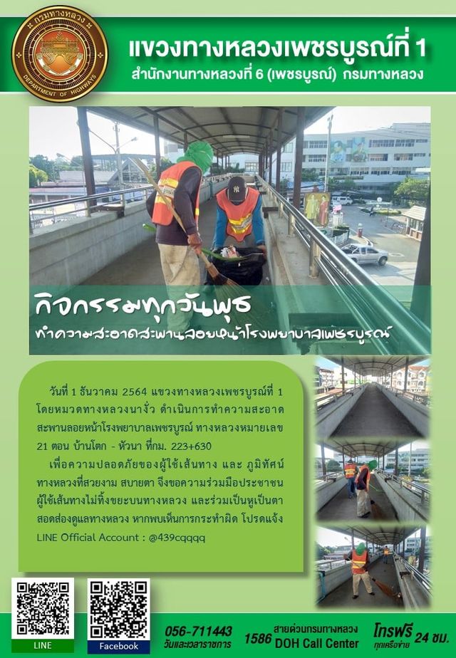 วันที่ 1 ธันวาคม 2564 แขวงทางหลวงเพชรบูรณ์ที่ 1 โดยหมวดทางหลวงนางั่ว ดำเนินการทำความสะอาดสะพานลอยหน้าโรงพยาบาลเพชรบูรณ์ ทางหลวงหมายเลข 21 ตอน บ้านโตก - หัวนา ที่กม. 223+630