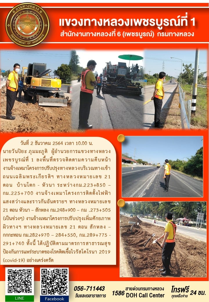 วันที่ 2 ธันวาคม 2564 เวลา 10.00 น. นายวันปิยะ ภุมมะภูติ ผู้อำนวยการแขวงทางหลวงเพชรบูรณ์ที่ 1 ลงพื้นที่ตรวจติดตามความคืบหน้างานจ้างเหมาโครงการปรับปรุงทางหลวงบริเวณทางเข้าถนนเฉลิมพระเกียรติฯ ทางหลวงหมายเลข 21 ตอน บ้านโตก - หัวนา ระหว่างกม.223+850 – กม.225+700 งานจ้างเหมาโครงการติดตั้งไฟฟ้าแสงสว่างและราวกันอันตรายฯ ทางหลวงหมายเลข 21 ตอน หัวนา – สักหลง กม.248+900 – กม .273+505 (เป็นช่วงๆ) งานจ้างเหมาโครงการปรับปรุงเพิ่มศักยภาพผิวทางฯ ทางหลวงหมายเลข 21 ตอน สักหลง – กกกะทอน กม.282+970 - 284+550, กม.289+775 -291+740 ทั้งนี้ ได้ปฏิบัติตามมาตรการสาธารณสุขป้องกันการแพร่ระบาดของโรคติดเชื้อไวรัสโคโรนา 2019 (covid-19) อย่างเคร่งครัด