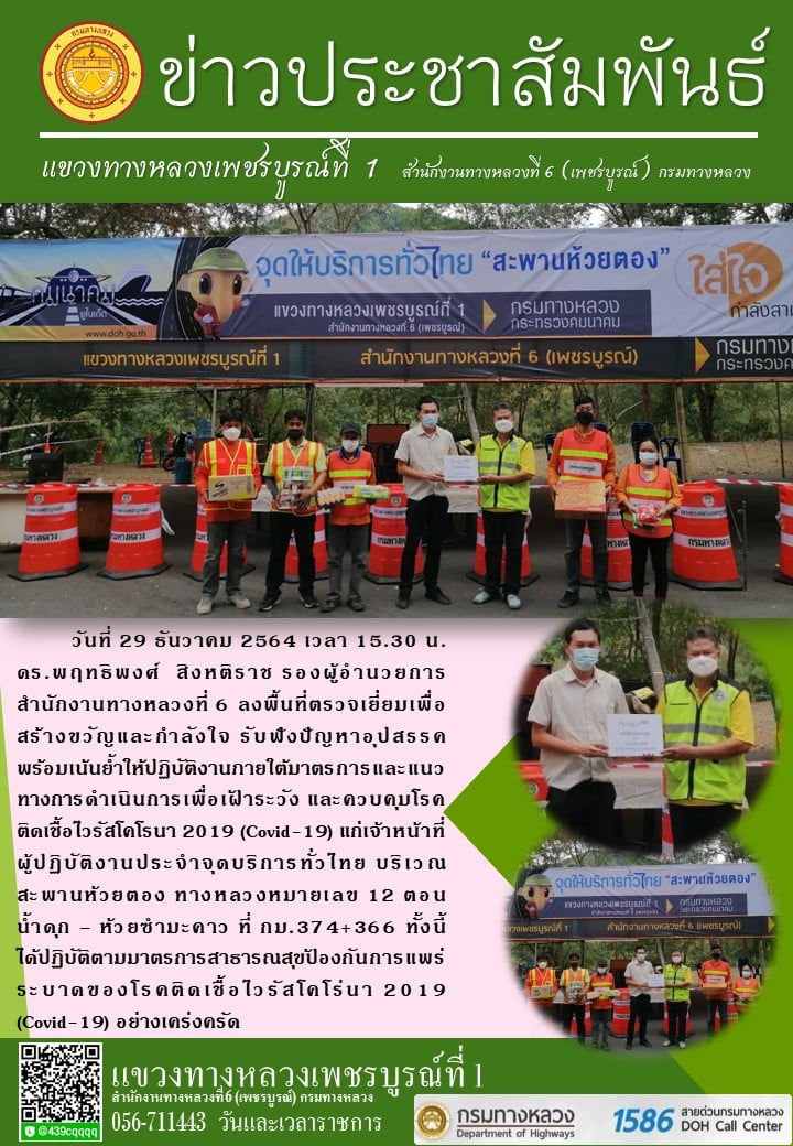 วันที่ 29 ธันวาคม 2564 เวลา 15.30 น. ดร.พฤทธิพงศ์ สิงหติราช รองผู้อำนวยการสำนักงานทางหลวงที่ 6 ลงพื้นที่ตรวจเยี่ยมเพื่อสร้างขวัญและกำลังใจ รับฟังปัญหาอุปสรรค พร้อมเน้นย้ำให้ปฏิบัติงานภายใต้มาตรการและแนวทางการดำเนินการเพื่อเฝ้าระวัง และควบคุมโรคติดเชื้อไวรัสโคโรนา 2019 (Covid-19) แก่เจ้าหน้าที่ผู้ปฏิบัติงานประจำจุดบริการทั่วไทย บริเวณสะพานห้วยตอง ทางหลวงหมายเลข 12 ตอน น้ำดุก – ห้วยซำมะคาว ที่ กม.374+366 ทั้งนี้ ได้ปฏิบัติตามมาตรการสาธารณสุขป้องกันการแพร่ระบาดของโรคติดเชื้อไวรัสโคโร่นา 2019 (Covid-19) อย่างเคร่งครัด