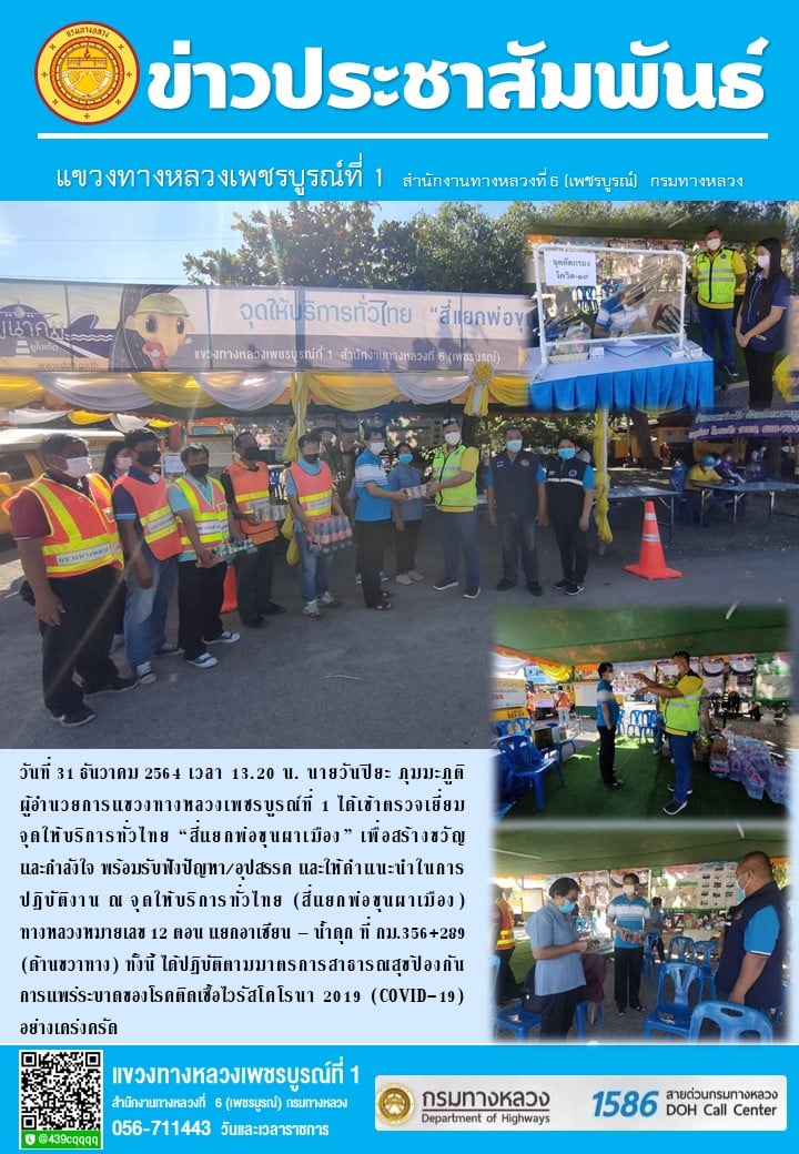 วันที่ 31 ธันวาคม 2564 เวลา 13.20 น. นายวันปิยะ ภุมมะภูติ ผู้อำนวยการแขวงทางหลวงเพชรบูรณ์ที่ 1 ได้เข้าตรวจเยี่ยมจุดให้บริการทั่วไทย “สี่แยกพ่อขุนผาเมือง” เพื่อสร้างขวัญและกำลังใจ พร้อมรับฟังปัญหา/อุปสรรค และให้คำแนะนำในการปฏิบัติงาน ณ จุดให้บริการทั่วไทย (สี่แยกพ่อขุนผาเมือง) ทางหลวงหมายเลข 12 ตอน แยกอาเซียน – น้ำดุก ที่ กม.356+289 (ด้านขวาทาง) ทั้งนี้ ได้ปฏิบัติตามมาตรการสาธารณสุขป้องกันการแพร่ระบาดของโรคติดเชื้อไวรัสโคโรนา 2019 (COVID-19) อย่างเคร่งครัด