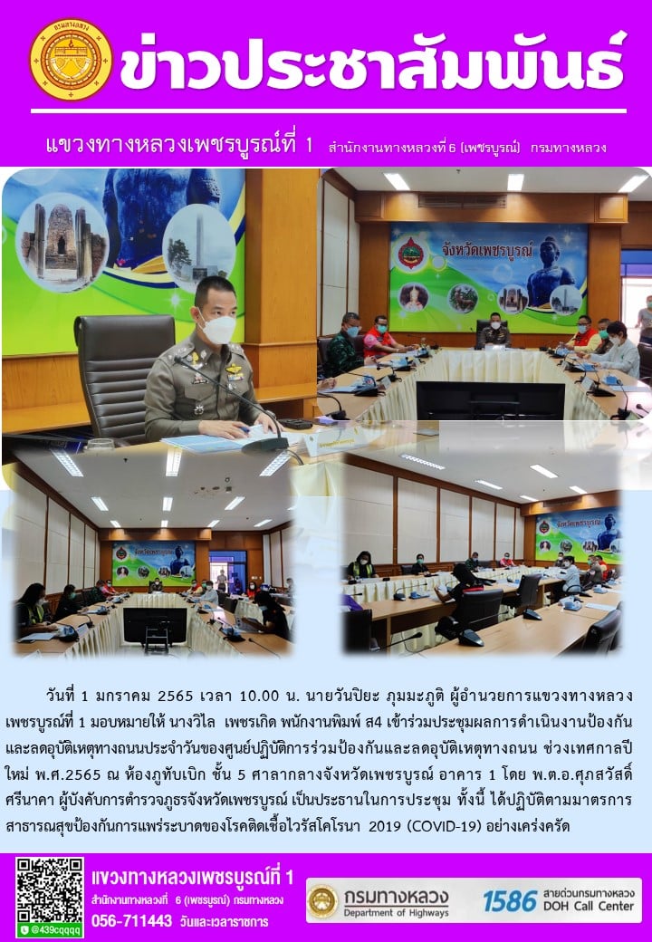 วันที่ 1 มกราคม 2565 เวลา 10.00 น. นายวันปิยะ ภุมมะภูติ ผู้อำนวยการแขวงทางหลวงเพชรบูรณ์ที่ 1 มอบหมายให้ นางวิไล เพชรเกิด พนักงานพิมพ์ ส4 เข้าร่วมประชุมผลการดำเนินงานป้องกันและลดอุบัติเหตุทางถนนประจำวันของศูนย์ปฏิบัติการร่วมป้องกันและลดอุบัติเหตุทางถนน ช่วงเทศกาลปีใหม่ พ.ศ.2565 ณ ห้องภูทับเบิก ชั้น 5 ศาลากลางจังหวัดเพชรบูรณ์ อาคาร 1 โดย พ.ต.อ.ศุภสวัสดิ์ ศรีนาคา ผู้บังคับการตำรวจภูธรจังหวัดเพชรบูรณ์ เป็นประธานในการประชุม ทั้งนี้ ได้ปฏิบัติตามมาตรการสาธารณสุขป้องกันการแพร่ระบาดของโรคติดเชื้อไวรัสโคโรนา 2019 (COVID-19) อย่างเคร่งครัด