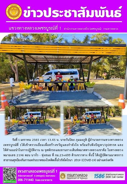 วันที่ 1 มกราคม 2565 เวลา 13.45 น. นายวันปิยะ ภุมมะภูติ ผู้อำนวยการแขวงทางหลวงเพชรบูรณ์ที่ 1ได้เข้าตรวจเยี่ยมเพื่อสร้างขวัญและกำลังใจ พร้อมรับฟังปัญหา/อุปสรรค และให้คำแนะนำในการปฏิบัติงาน ณ จุดพักรถและลานกางเต็นท์หมวดทางหลวงเขาค้อ ในทางหลวงหมายเลข 2196 ตอน นางั่ว - ทุ่งสมอ ที่ กม.23+600 ด้านขวาทาง ทั้งนี้ ได้ปฏิบัติตามมาตรการสาธารณสุขป้องกันการแพร่ระบาดของโรคติดเชื้อไวรัสโคโรนา 2019 (COVID-19) อย่างเคร่งครัด