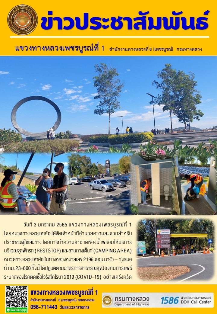 วันที่ 3 มกราคม 2565 แขวงทางหลวงเพชรบูรณ์ที่ 1 โดยหมวดทางหลวงเขาค้อ ได้จัดเจ้าหน้าที่อำนวยความสะดวกสำหรับประชาชนผู้ใช้เส้นทาง โดยการทำความสะอาดห้องน้ำพร้อมให้บริการ บริเวณจุดพักรถ (REST STOP) และลานกางเต็นท์ (CAMPING AREA) หมวดทางหลวงเขาค้อ ในทางหลวงหมายเลข 2196 ตอน นางั่ว – ทุ่งสมอ ที่ กม.23+600 ทั้งนี้ ได้ปฏิบัติตามมาตรการสาธารณสุขป้องกันการแพร่ระบาดของโรคติดเชื้อไวรัสโคโรนา 2019 (COVID-19) อย่างเคร่งครัด