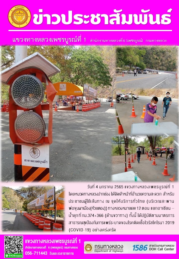 วันที่ 4 มกราคม 2565 แขวงทางหลวงเพชรบูรณ์ที่ 1 โดยหมวดทางหลวงปากช่อง ได้จัดเจ้าหน้าที่อำนวยความสะดวก สำหรับประชาชนผู้ใช้เส้นทาง ณ จุดให้บริการทั่วไทย (บริเวณสะพานพ่อขุนผาเมือง(ห้วยตอง)) ทางหลวงหมายเลข 12 ตอน แยกอาเซียน – น้ำดุก ที่ กม.374+366 (ด้านขวาทาง) ทั้งนี้ ได้ปฏิบัติตามมาตรการสาธารณสุขป้องกันการแพร่ระบาดของโรคติดเชื้อไวรัสโคโรนา 2019 (COVID-19) อย่างเคร่งครัด